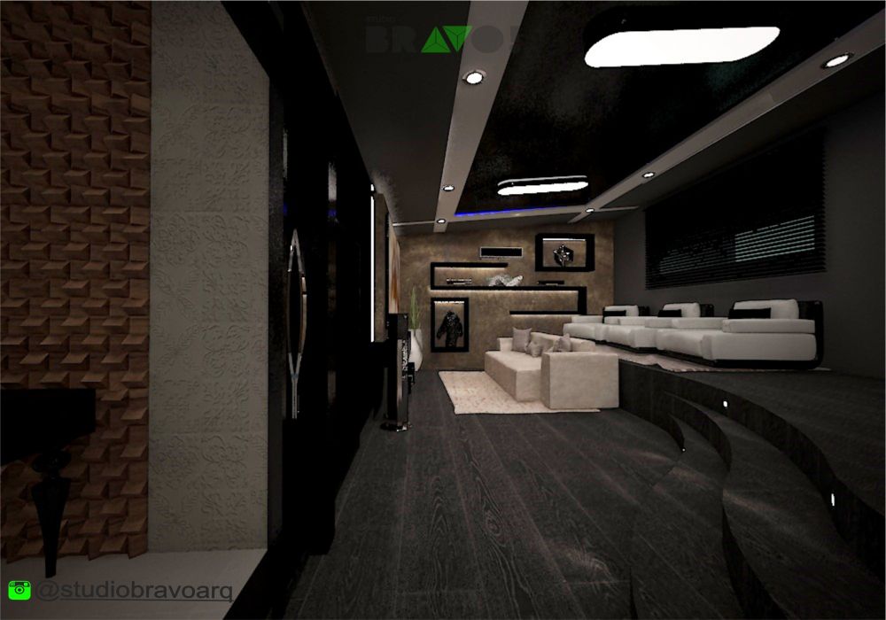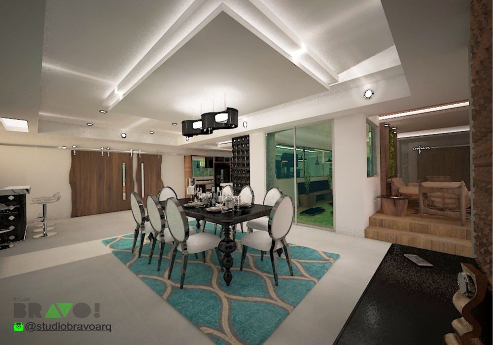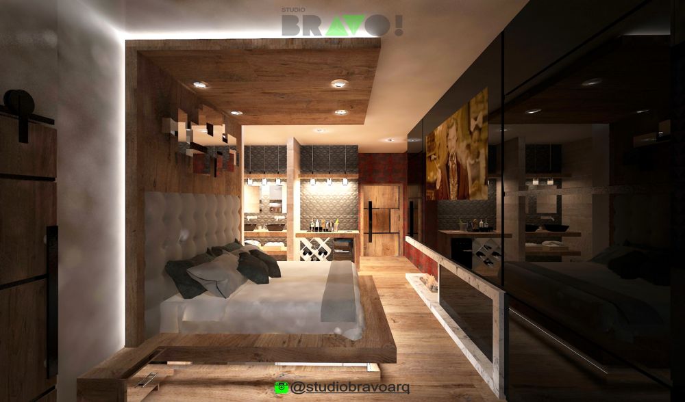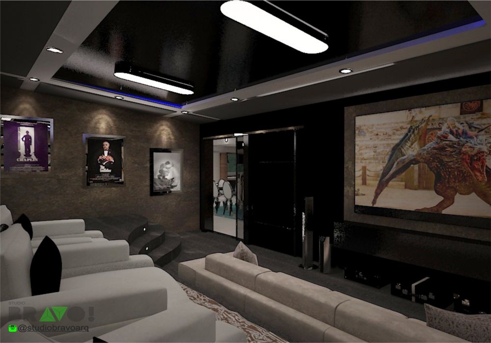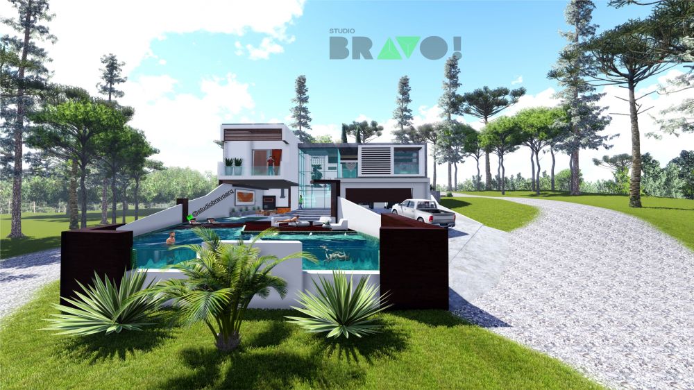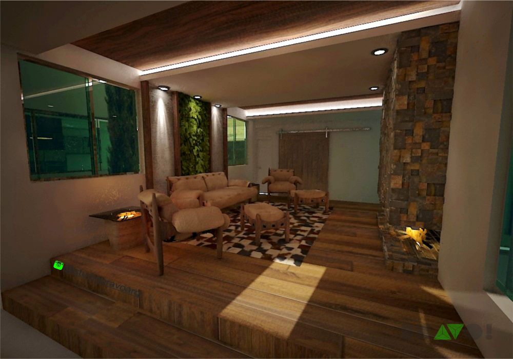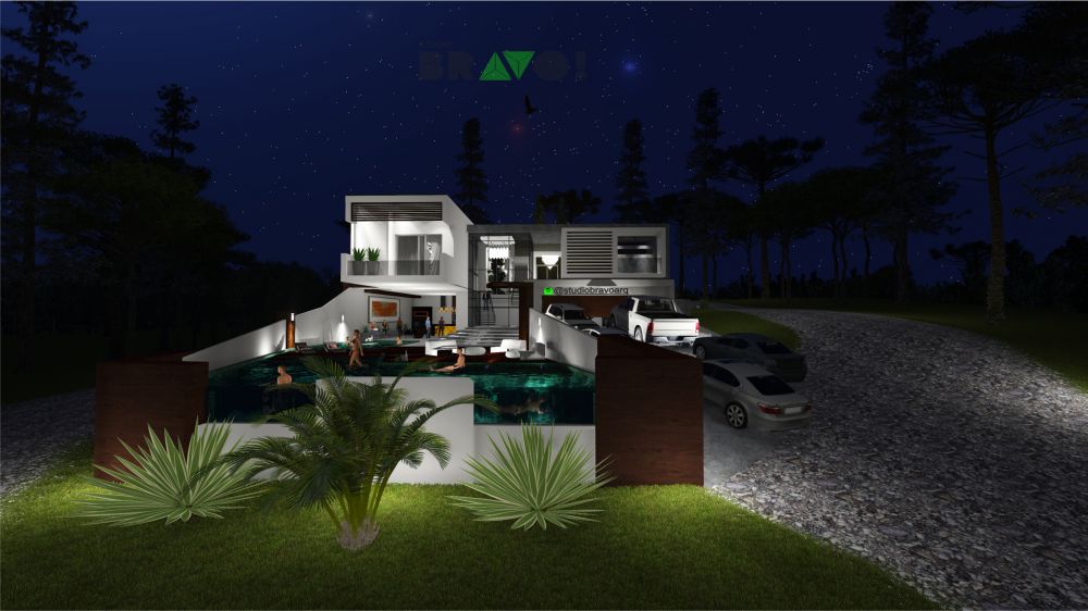A edificação tem como um dos principais objetivos a função social. Por este motivo e por se tratar de um terreno isolado, tem a área de lazer na fachada principal da residência, tornando-se mais convidativa e aconchegante aos amigos que serão recebidos. O recuo da estrutura livrou as fachadas de elementos estruturais, permitindo a liberdade desta ser composta sem interrupções, por materiais como vidro e madeira, que se realçam nos acabamentos. A partir da disposição dos volumes do pavimento superior definem-se as áreas íntima e social, esta última, totalmente voltada ao jardim interno que garante a iluminação e ventilação necessária. A sala de jantar da mesma forma que a cozinha, dispõe de materiais claros e espaços amplos, ambos com detalhes escuros e de acabamentos amadeirados, o que traz um aconchego singular a esses espaços. Também fazendo parte da área social, a sala de estar é totalmente pensada para receber e manter os usuários em um máximo conforto, evidenciando a madeira nos acabamentos e, uma lareira elegante e imponente com revestimento em pedra. Para desfrutar de total conforto e potencializar o desempenho do ambiente, o home cinema foi planejado com forro inclinado, piso com nível crescente, revestimentos com materiais e tons adequados. A suíte máster ganhou papel de destaque, com uma atmosfera que apresenta o rústico e o elegante, em um espaço todo voltado para o descanso e convívio íntimo.