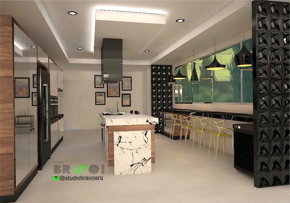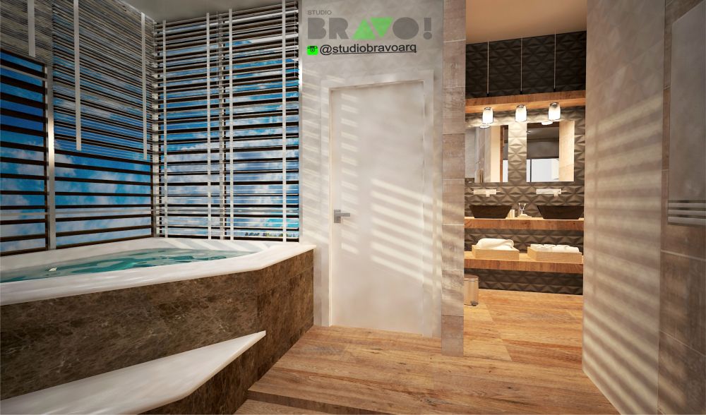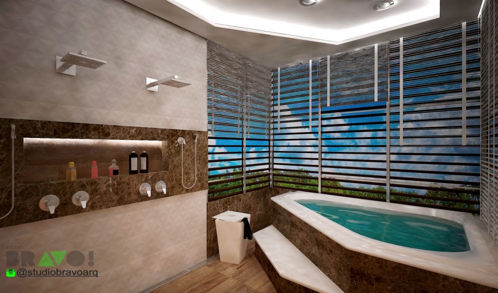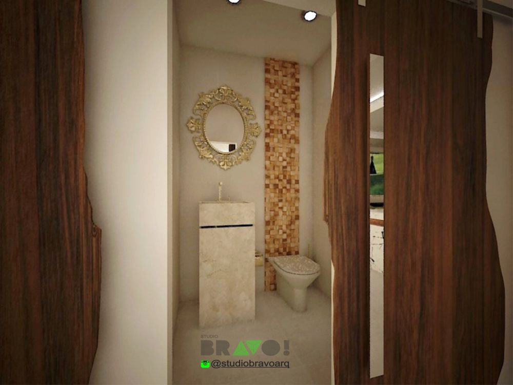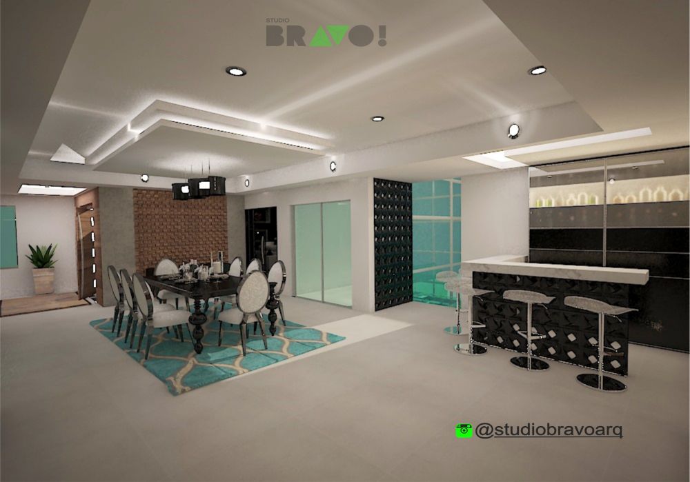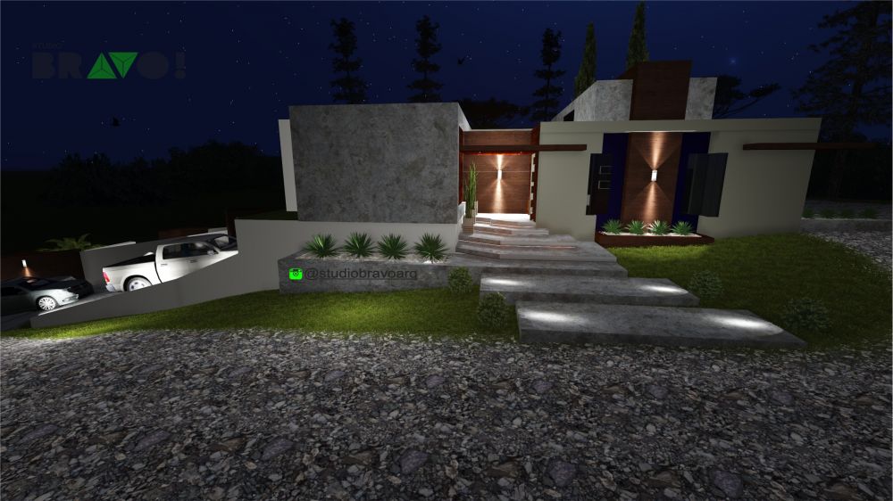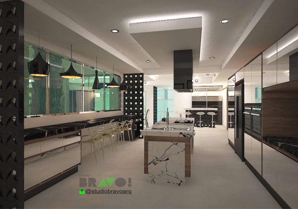A edificação tem como um dos principais objetivos a função social. Por este motivo e por se tratar de um terreno isolado, tem a área de lazer na fachada principal da residência, tornando-se mais convidativa e aconchegante aos amigos que serão recebidos. O recuo da estrutura livrou as fachadas de elementos estruturais, permitindo a liberdade desta ser composta sem interrupções, por materiais como vidro e madeira, que se realçam nos acabamentos. A partir da disposição dos volumes do pavimento superior definem-se as áreas íntima e social, esta última, totalmente voltada ao jardim interno que garante a iluminação e ventilação necessária. A sala de jantar da mesma forma que a cozinha, dispõe de materiais claros e espaços amplos, ambos com detalhes escuros e de acabamentos amadeirados, o que traz um aconchego singular a esses espaços. Também fazendo parte da área social, a sala de estar é totalmente pensada para receber e manter os usuários em um máximo conforto, evidenciando a madeira nos acabamentos e, uma lareira elegante e imponente com revestimento em pedra. Para desfrutar de total conforto e potencializar o desempenho do ambiente, o home cinema foi planejado com forro inclinado, piso com nível crescente, revestimentos com materiais e tons adequados. A suíte máster ganhou papel de destaque, com uma atmosfera que apresenta o rústico e o elegante, em um espaço todo voltado para o descanso e convívio íntimo.